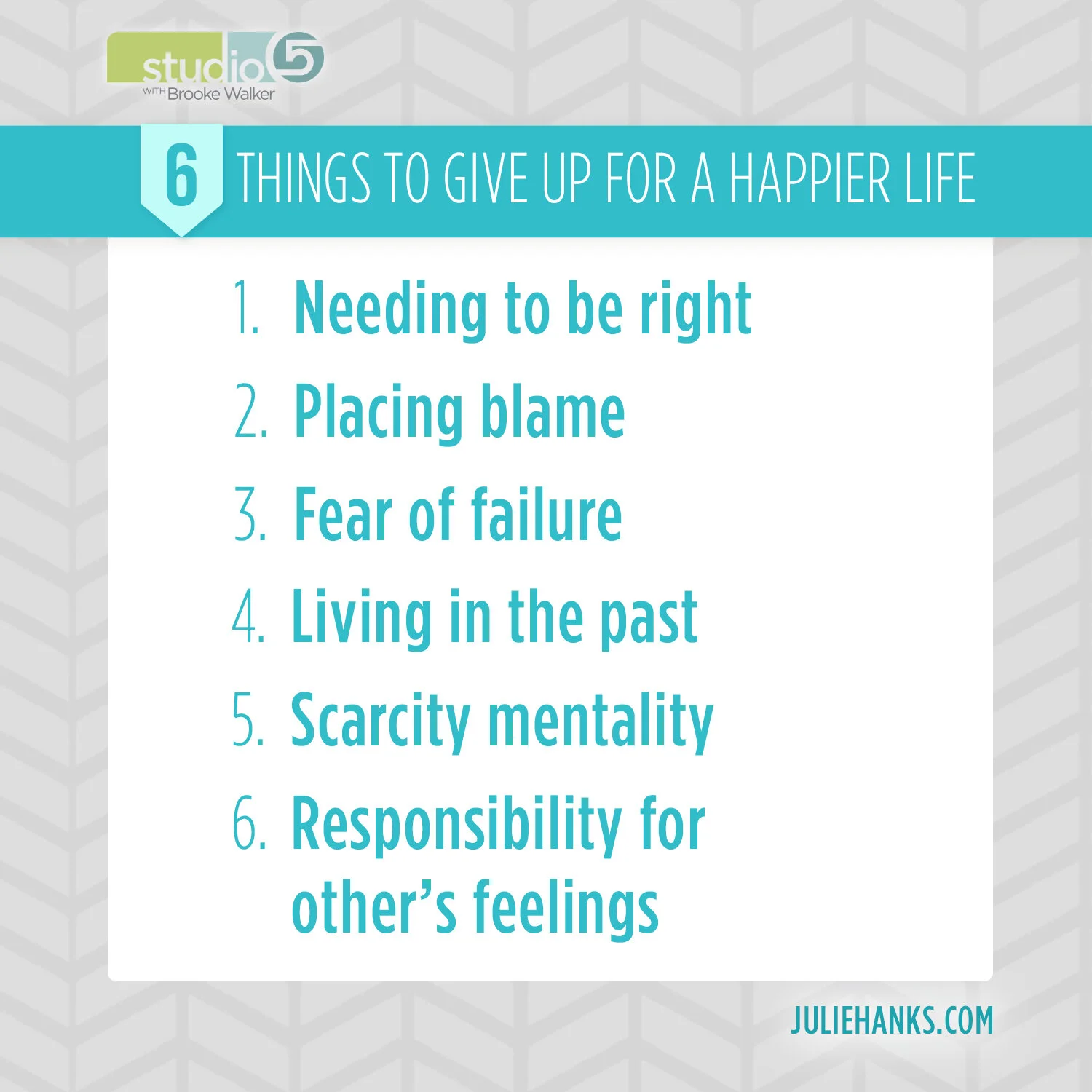 So often we define our happiness by all we have. But perhaps the key to a happier life is giving up certain things. Studio 5 Self-Improvement Contributor Julie Hanks, LCSW reveals six things to give up for a happier life. Watch the interview!
